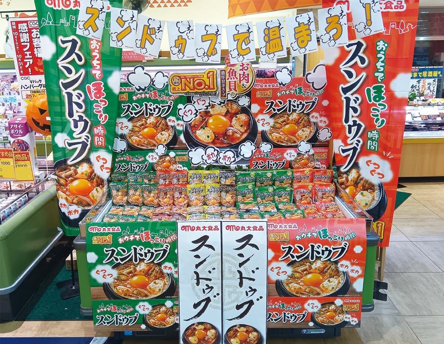 陳列においては、左に「スンドゥブ マイルド」の緑、右に「スンドゥブ 辛口」の赤と色で分けるパネルとのぼりがインパクトを生み出しており、ここでも視認効果をアップしている。