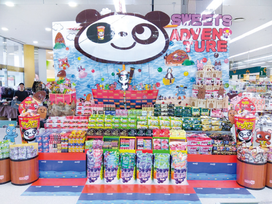 実際の陳列は、自作した「おかしの宝箱」をめざし、明治製品のキャラクターたちが大航海に挑むというデザインを設定。海と船をあしらった巨大なバックボード制作には2~3週間かかったという。