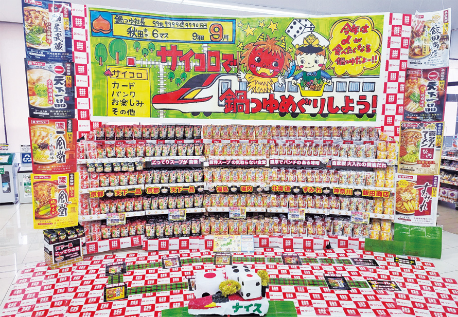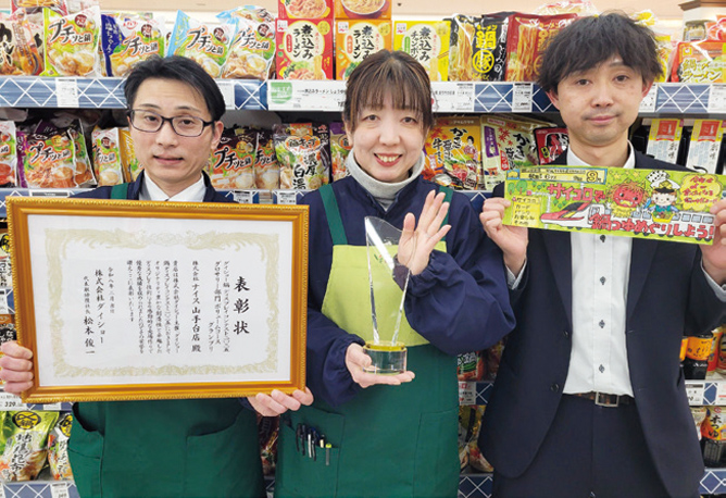 昨年の9月から11月にかけて実施されたダイショーの「“鍋”ディスプレイコンテスト2025」において、グロサリー部門ボリュームコースのグランプリを受賞したのは㈱ナイス(秋田県秋田市、齋藤寛之代表取締役社長)のナイス山手台店である。店長の加藤周氏は「念願のグランプリだったので、受賞の一報が入った時はスタッフと思わずハイタッチをして喜び合いました」と語り、売場づくりを行った一般食品部門担当の佐藤菜津美氏は「2022年から参加していて、3年連続で準グランプリでした。やっとグランプリを取れたので、とてもうれしかった」と笑顔で話してくれた。