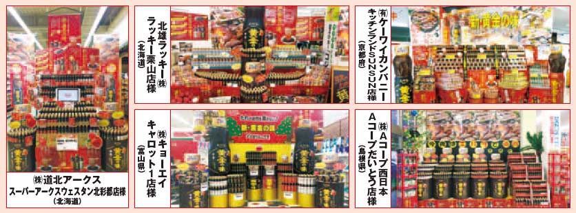 | (株)オークワ スーパーセンターオークワ中津川店様(岐阜県) 売場上段で展開した商品ボトルを活用した大型手づくり「人形POP」が売場にインパクトを与えており、子供連れの家族などに大変好評な売場になりました。また、下段の樽を使った陳列などで変化をもたせるなどの工夫も見られます。 | ユニー(株) アピタ東海荒尾店様(愛知県) 売場の正面には「黄金の味」の大量陳列、裏面には「おろしのたれ」を大量陳列した迫力ある売場になっています。また、フロアPOPもお客様の立ち寄り率アップに一役買っており、優秀賞にふさわしい見事な売場実現がなされています。 |