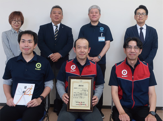 ㈱PLANT PLANT-5 見附店 前店長の安齋知之氏(後列右から2番目)と店長の平賀洋平氏(前列右)、副店長の木谷友博氏(前列中央)、一般食品 菓子担当の野本大輔氏(前列左)