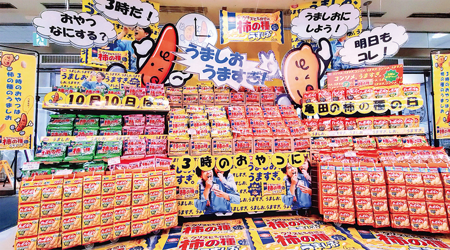 グランプリを受賞したディスプレイは、必ずお客さまの目に触れる店内入ってすぐの位置に設置され、「亀田の柿の種 うましお」への訴求力アップをねらい、立体的に組み上げられたものだ。