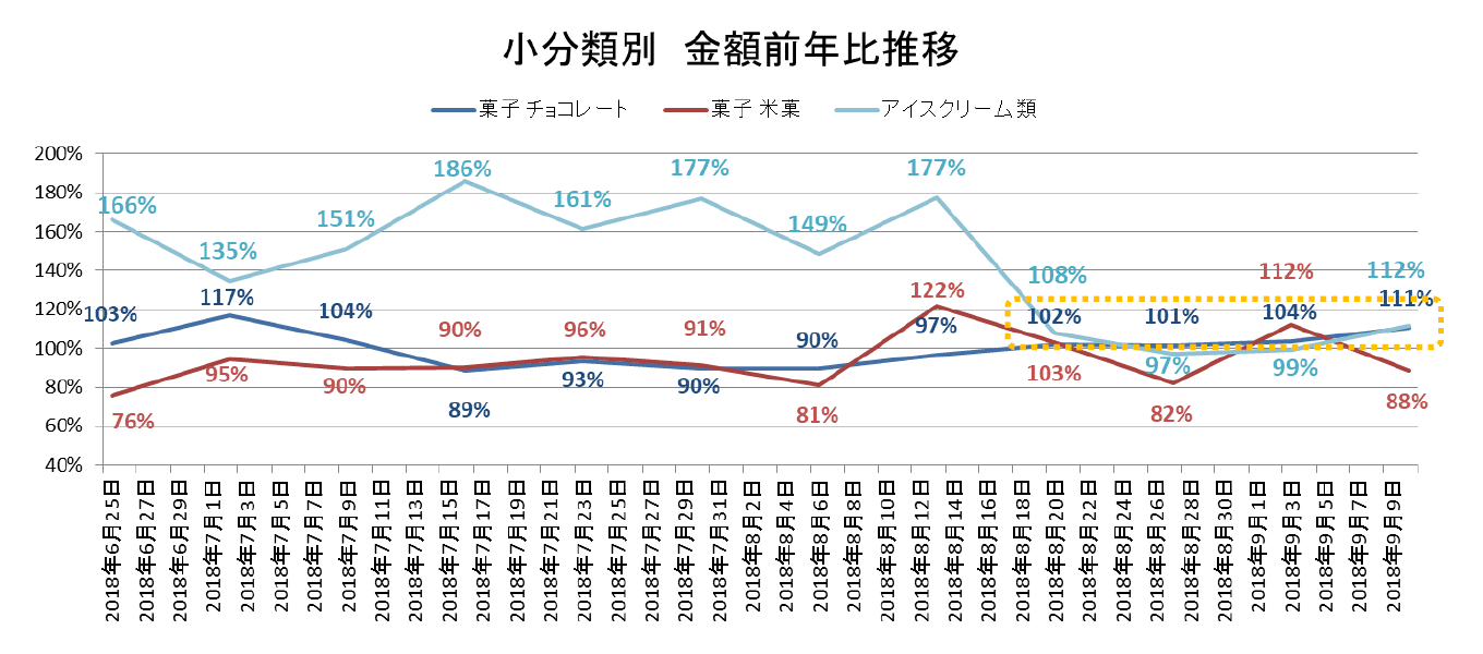 猛暑の影響もあり、アイスの前年比が大きく伸長。ただし、チョコレートも伸長している事から「大人の」商品自体も伸長している事が伺える。加工食品では、蒲鉾や佃煮の前年比が伸長。