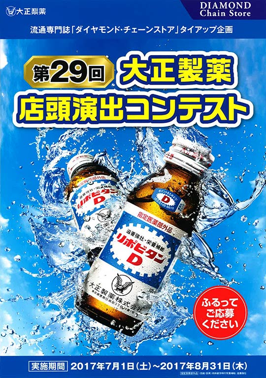 | 参加条件 | 対象商品を実施期間中に1週間以上陳列していただくこと [タワー演出表彰コース]「55th ANNIVERSARY リポビタン GO!GO!キャンペーン」の演出 [1本・3本演出表彰コース]リポビタンシリーズ(リポビタンD10本、Dライトの10本箱を除く)、アルフェシリーズの1本・3本、ゼナシリーズ1本・3本とパブロン滋養内服液シリーズ展開 |